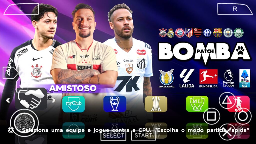 Mesmo sendo um jogo para o emulador PPSSPP, o Bomba Patch 2026 100% Atualizado tem vários modos de jogo, desde casual ou até mesmo para fazer história. O meu preferido é o Rumo ao Estrelato, nesse modo você controla apenas um jogador, mais para quem é mais chegado, a Master League é o preferido dos players. Na Master League você controle um time por completo. Para jogar de primeira, recomendo o modo amistoso, nele você seleciona o time que deseja, seleciona o time contra, e muda algumas configurações especificas. Tem também a opção de jogar ligas e copas fora da Master League e do Rumo ao Estrelato, ao todo são 6 ligas e 6 copas. Para aprender a jogar o Bomba Patch 2026 100% Atualizado, use o modo treinamento, nele tem tudo que você precisa para aprender as melhores jogadas.