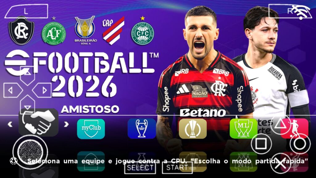 Nova atualização oficial do Efootball pes 2026 para PPSSPP com Brasileirão e Europeus, dessa vez o jogo veio com novas novidades, uma delas é a criação de uma nova liga e foi adicionado novos times que subiram de divisão. Efootball 2026 PPSSPP com Brasileirão e Europeus é um jogo de futebol 100% atualizado com 6 ligas oficiais para jogar na Master League e também no Rumo ao Estrelato, fora isso temos as competições principais como a Uefa Champions League e a Uefa Europa League, nesse jogo não tem a Copa Libertadores da América, porém, tem a Copa do Brasil atualizada.