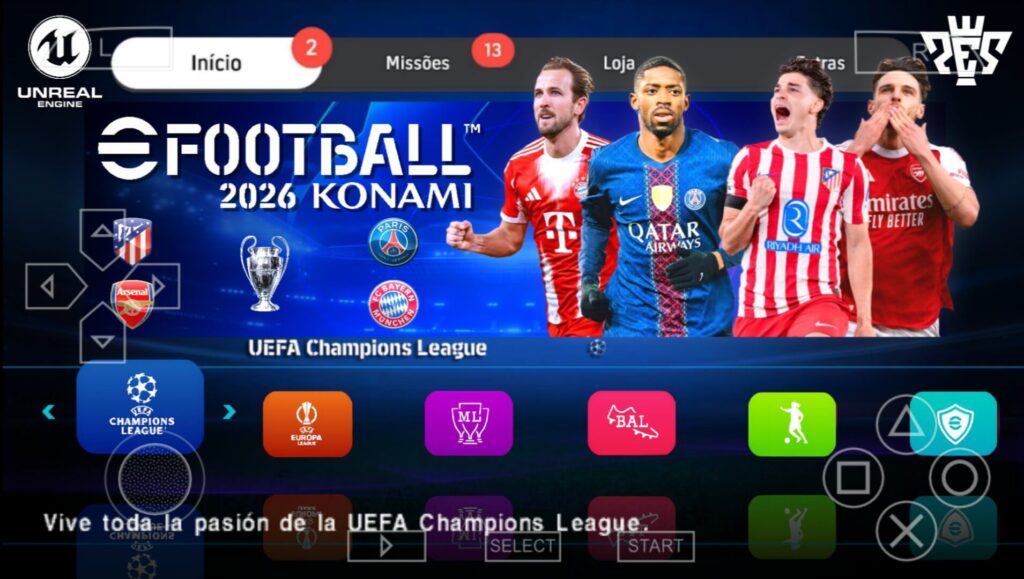 Ao ganhar uma dessas ligas no Efootball 2026 PPSSPP Europeus, ou ficar entre os quatro primeiros você disputa a Uefa Champions League, abaixo disso até mais ou menos o décimo lugar você disputa a Uefa Europa League e também a Uefa Conferênce League. Nesse jogo também temos as novas convocações para seleções 100% atualizadas, você pode jogar a Copa América ou Copa do Mundo com Brasil e Argentina atualizados, fora isso tem todas as outras copas de continentes.