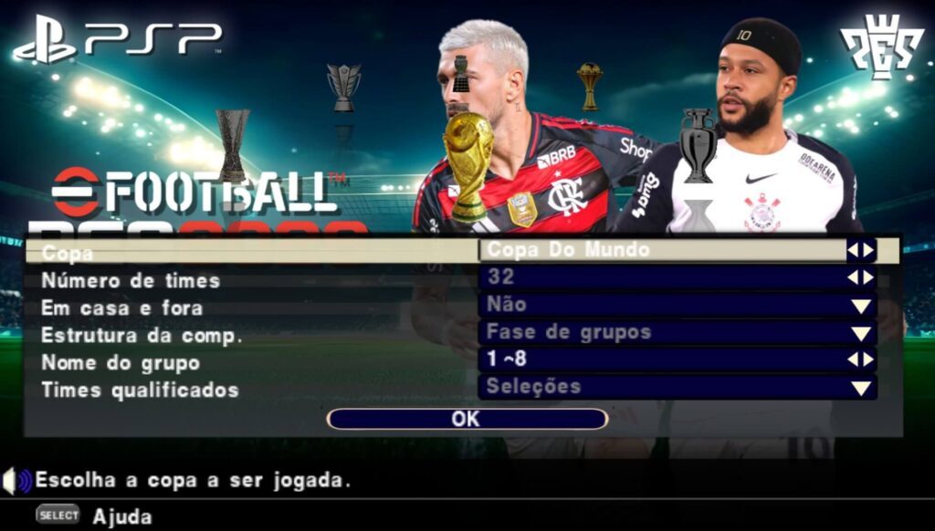 Nova atualização oficial do Efootball pes 2026 para PPSSPP com Brasileirão e Europeus, dessa vez o jogo veio com novas novidades, uma delas é a criação de uma nova liga e foi adicionado novos times que subiram de divisão. Efootball 2026 PPSSPP com Brasileirão e Europeus é um jogo de futebol 100% atualizado com 6 ligas oficiais para jogar na Master League e também no Rumo ao Estrelato, fora isso temos as competições principais como a Uefa Champions League e a Uefa Europa League, nesse jogo não tem a Copa Libertadores da América, porém, tem a Copa do Brasil atualizada.